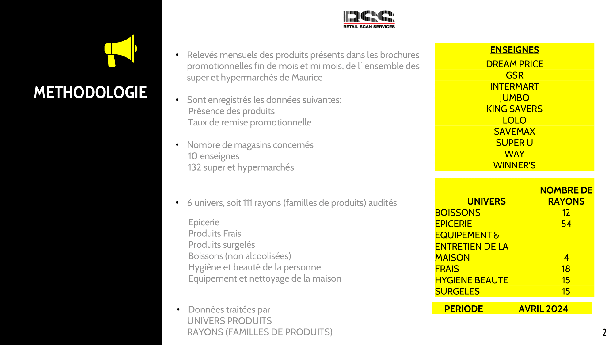 Retail Scan Services est une société de marketing Retail qui fournit des services tels que les etudes sondages, store scan, promo scan, category management merchandising, tracking et de la formation commerciale et merchandising.